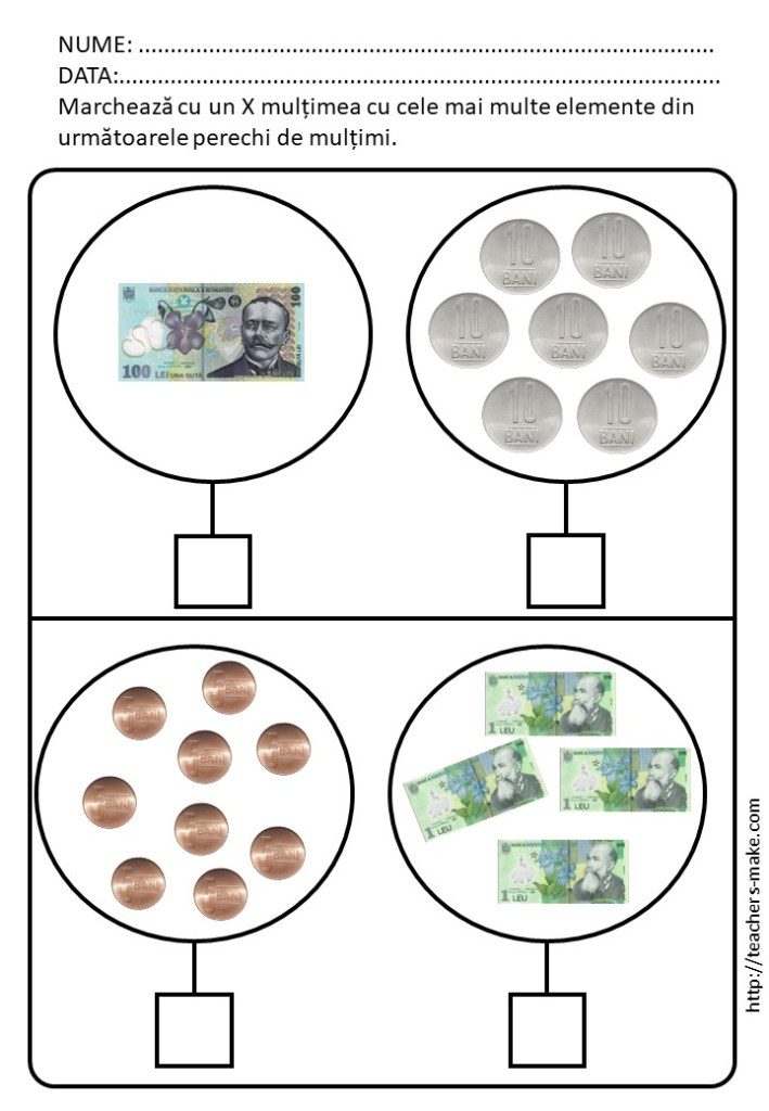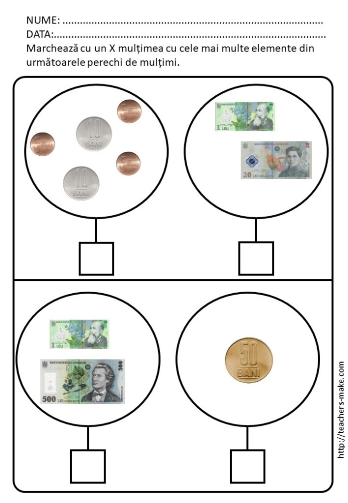 – un set de fișe de lucru care permite copiilor să exerseze diferențierea globală între monede și bancnote