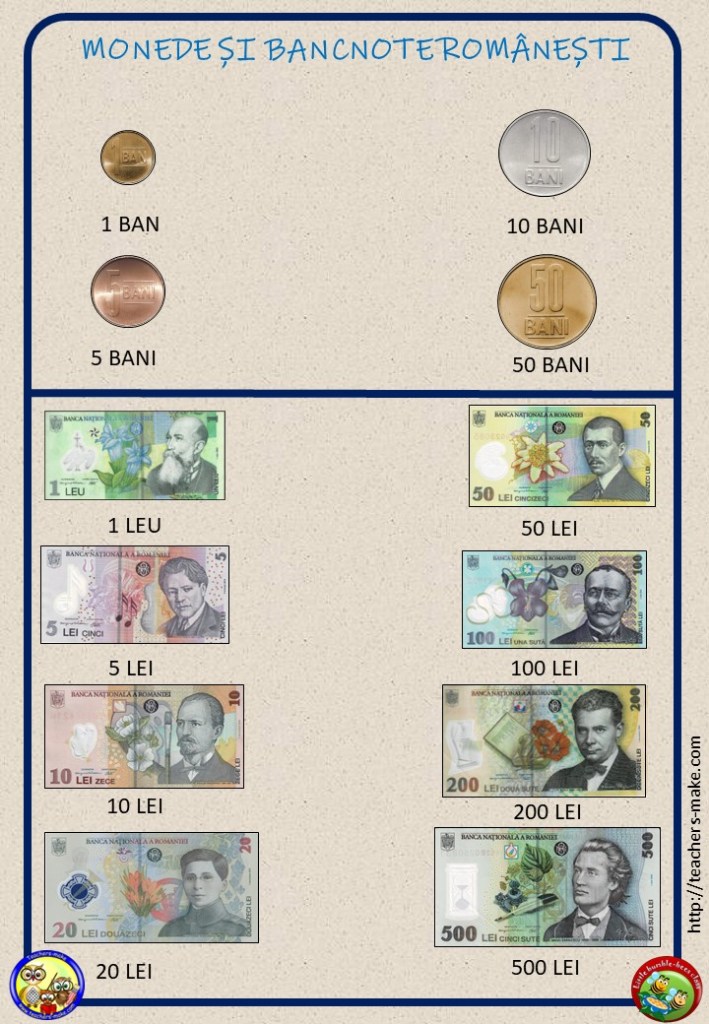 -o pagină care prezintă monedele și bancnotele puse în circulație în România (vă recomandăm să o plastifiați)