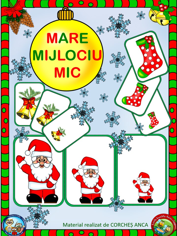 Acest material cuprinde un număr de 60 de carduri cu imagini de dimensiuni diferite, având ca obiectiv învățarea noțiunilor de ”mare”, ”mijlociu” și ”mic”. Imaginile sunt simple, cu tematică specifică Sărbătorilor de iarnă, fapt care facilitează percepția acestora și motivează copiii pentru activitate.